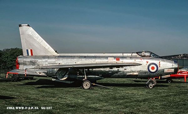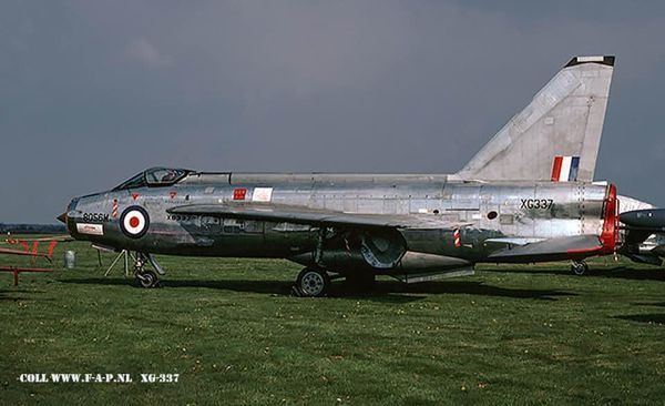 XG336; C/N 95025 ff J.W.C. Squier 25-8-59 Samlesbury. To the AFDS, Coltishall, as aircraft ‘C’, 12-59. Returned to Warton approx 3.62 fitted with F3 fin. Delivered A&AEE Boscombe Down, for Red Top trials 9-65. To RAF Cosford (?) (sic, in original record card) as instructional airframe 8091M, 5-70; to Halton, 11-72.