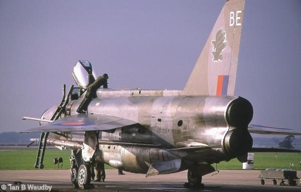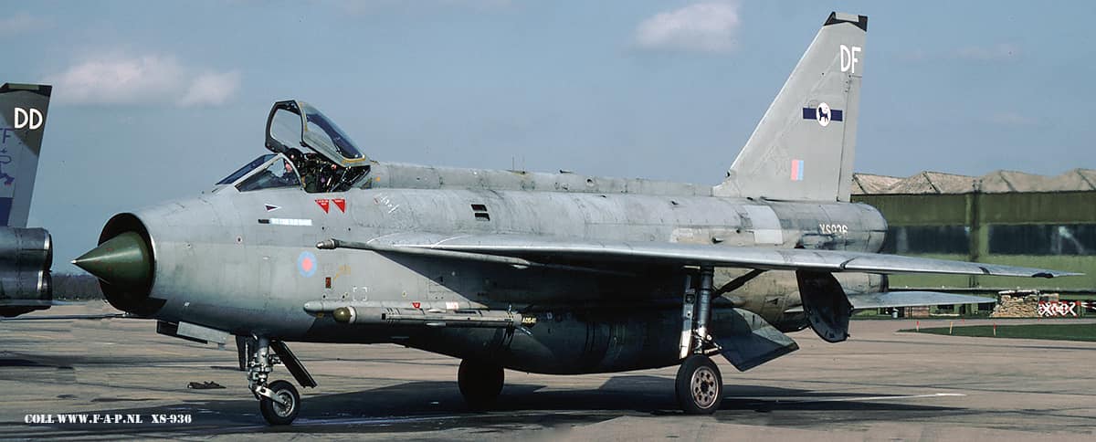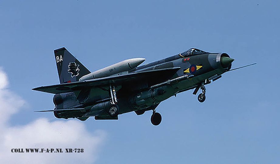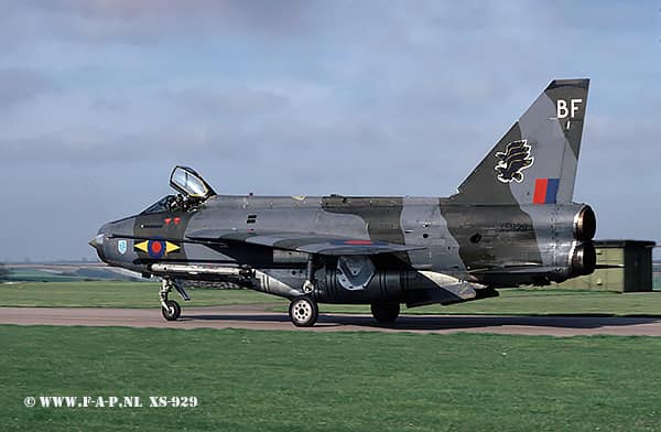 XS928; C/N 95261 ff R.P. Beamont 28-2-67 Samlesbury. To 11 Squadron, 4-4-67; to 74 Squadron (L). Cat 4 damage in fire at Tengah, 6-4-70; returned to Warton by air; returned to 23 Squadron, 14-7-72; to 56 Squadron (E), Cyprus. With 11 Squadron (BJ) at Binbrook, 1983. Currently with BAe, Warton Aerodrome, nr Preston in storage. Potential gate guard at Mill Lane entrance by the Lightning Club.