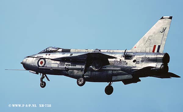 XR758; C/N 95223 ff J.K. Isherwood 30-8-65 Samlesbury. To 5 Squadron (D), 11-1-66. Full F 6 modification, 16-3-67; to 11 Squadron, 24-4-68 and 74 Squadron (J). Cat 4 damage in Darwin, Australia, 11/12-69; returned to Warton, 16-1-70; reissued to 23 Squadron, 26-4-71. To 60 MU, 26-9-73; with 5 Squadron (AF), Binbrook, 1983. Reported has been scrapped at RAF Laarbruch, Germany.