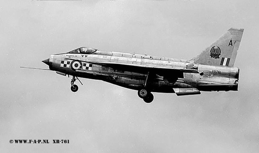 XR761; C/N 95226 ff D.M. Knight 30-9-65 as Interim F.6. To 5 Sqn (J) 15-2-66; to 23 Sqn (P) 8-5-67; to Warton 19-1-68 for full F.6 conversion; to 5 Sqn 4-11-69; to 56 Sqn (A) 6-9-71; to 11 Sqn 29-5-73; to 56 Sqn 21-1-75; to 11 Sqn (F) 9-7-79; Crashed 8-11-84 3 miles off Donna Nook Range after double engine fire. Pilot ejected safely.
