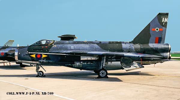 XR772; C/N 95237 ff J. Dell 10-2-66 Samlesbury. To 74 Squadron, 21-10-66; to 5 Squadron (E) during 1973. Inactive at Binbrook, 1983. Aircraft was lost when it crashed into the North Sea on March 6th 1985 killing the pilot. Fin top marked 5 Sqn 'AA' and '11' Sqn BA erected in grounds of Binbrook primary school