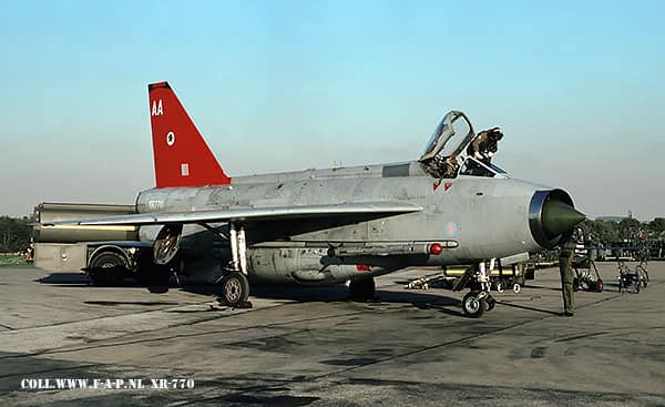 XR770; C/N 95235 ff R.P. Beamont 16-12-66 Samlesbury. To 74 Squadron, 26-9-66. Prior to delivery, flown on ten occasions at 1966 SBAC Display in Saudi Arabian markings. With the LAF(X), Binbrook, 1983. Presented to the town of Grimsby by RAF Binbrook. Restored and preserved by the NATO Aircraft Museum, South Humberside, 2010 on loan to 5 Squadron at RAF Waddington. Now residing at RAF Manston History Museum, Ramsgate, Kent