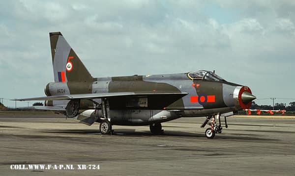 English Electric Lightning F.6 XR724 was the first to be retired of the five Lightnings allocated by the MoD to British Aerospace at Warton as chase aircraft in the Tornado Foxhunter radar development trials. Her Fatigue Index (FI) was coming perilously close to zero, and so she was flown to RAF Shawbury for storage while she still had some FI left on the airframe. Once below zero she would not have been able to fly again under any circumstances.